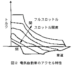 図2はアクセルの踏み代をパラメータとした電気自動車のモータトルク制御特性の一例であり、基本的にはアクセルの踏み代に対して比例してトルクを発生しており、高速ではエンジンブレーキ相当の負のトルク(減速トルク)を発生させている。